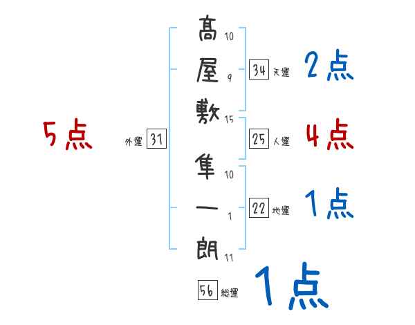 総運![]() | 髙屋敷隼一朗さんの総運は56画の1つ星!消極的で無気力になりがち。誠実な気持ちが必要でしょう。 あなたの人生を表す1番重要な運勢です。生涯を通じて影響する総合運となり、主に50歳以降の晩年期に影響を及ぼします。 |