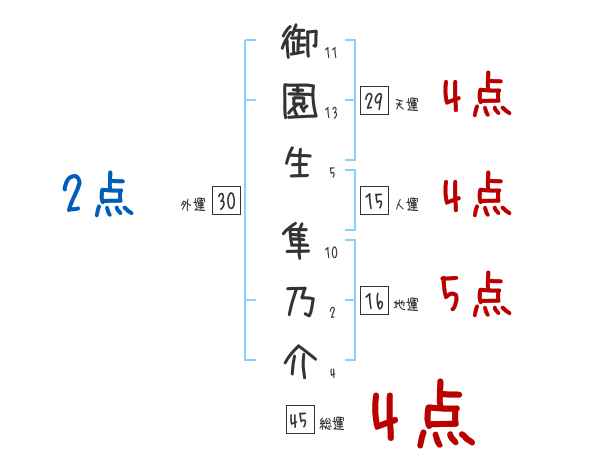 総運![]() | 御園生隼乃介さんの総運は45画の4つ星!もくもくと物事を進め達成する。地味な努力家。 あなたの人生を表す1番重要な運勢です。生涯を通じて影響する総合運となり、主に50歳以降の晩年期に影響を及ぼします。 |