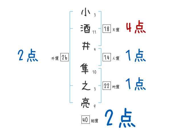 外運![]() | 小酒井隼之亮さんの外運は26画の2つ星!波瀾万丈かも。信頼できる人を大事にしましょう。 生活面を象徴する運勢です。外部から受ける影響力を表し、結婚運、家庭運や職場、環境への順応性を表します。 |