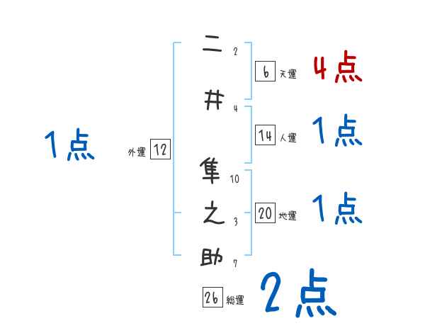 天運![]() | 二井隼之助さんの天運は6画の4つ星!慎重な努力家で信頼を得る。誠実な精神で向上心に優れる。 家系が持つ宿命的な運勢を表します。祖先から受け継いだ苗字ですので自分の力が及びません。家柄を象徴します。 |