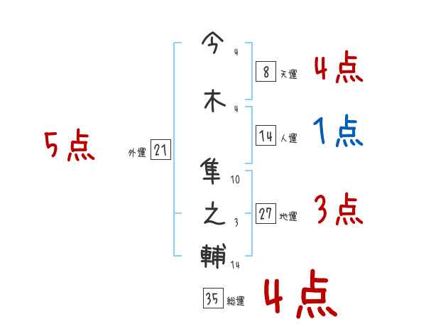 総運![]() | 今木隼之輔さんの総運は35画の4つ星!温厚な性格で感受性が高い。穏和な性格で人望が厚い。 あなたの人生を表す1番重要な運勢です。生涯を通じて影響する総合運となり、主に50歳以降の晩年期に影響を及ぼします。 |