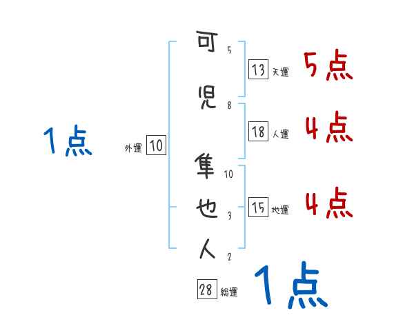 総運![]() | 可児隼也人さんの総運は28画の1つ星!家庭環境に注意。スポーツで活躍できる能力があるかも。 あなたの人生を表す1番重要な運勢です。生涯を通じて影響する総合運となり、主に50歳以降の晩年期に影響を及ぼします。 |