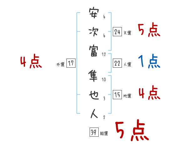 天運![]() | 安次富隼也人さんの天運は24画の5つ星!家庭運が良く順調な人生。金運にも恵まれる。 家系が持つ宿命的な運勢を表します。祖先から受け継いだ苗字ですので自分の力が及びません。家柄を象徴します。 |