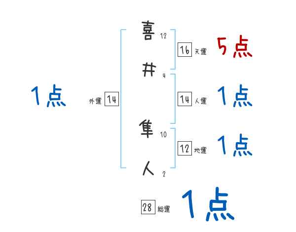 天運![]() | 喜井隼人さんの天運は16画の5つ星!人望が厚く大きく発展する。逆転成功が見える。 家系が持つ宿命的な運勢を表します。祖先から受け継いだ苗字ですので自分の力が及びません。家柄を象徴します。 |