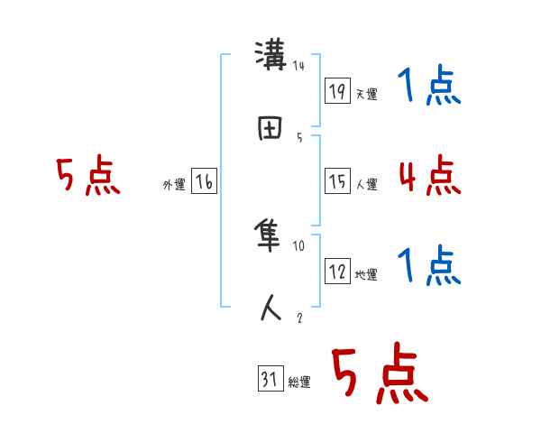 天運![]() | 溝田隼人さんの天運は19画の1つ星!優れた才能を持ちますが、協調性が足りないことも。周りの人と協力する事を意識しましょう。 家系が持つ宿命的な運勢を表します。祖先から受け継いだ苗字ですので自分の力が及びません。家柄を象徴します。 |