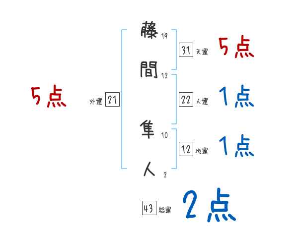 総運![]() | 藤間隼人さんの総運は43画の2つ星!頑固な性格で独立心が強いかも。やや非現実的で浪費に注意しましょう。 あなたの人生を表す1番重要な運勢です。生涯を通じて影響する総合運となり、主に50歳以降の晩年期に影響を及ぼします。 |