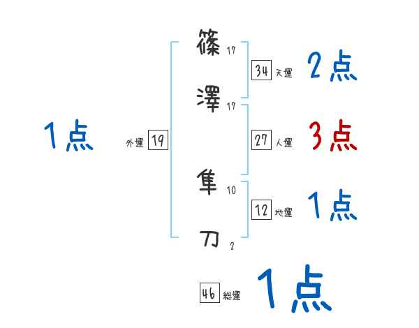 総運![]() | 篠澤隼刀さんの総運は46画の1つ星!迷走することが多く苦労するかも。目先のことにとらわれないように。 あなたの人生を表す1番重要な運勢です。生涯を通じて影響する総合運となり、主に50歳以降の晩年期に影響を及ぼします。 |