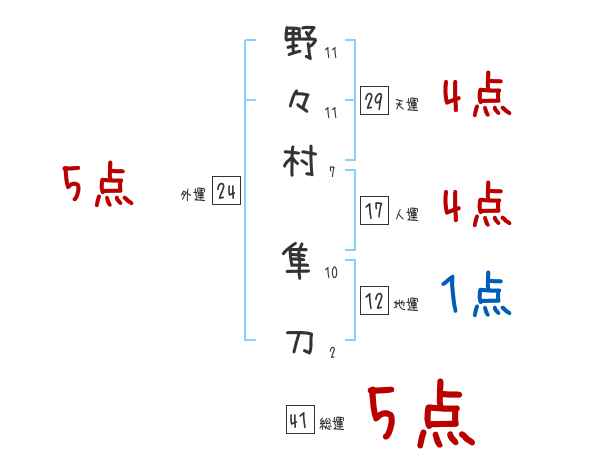 天運![]() | 野々村隼刀さんの天運は29画の4つ星!完全主義で才能がある。厳格な心の持ち主。 家系が持つ宿命的な運勢を表します。祖先から受け継いだ苗字ですので自分の力が及びません。家柄を象徴します。 |