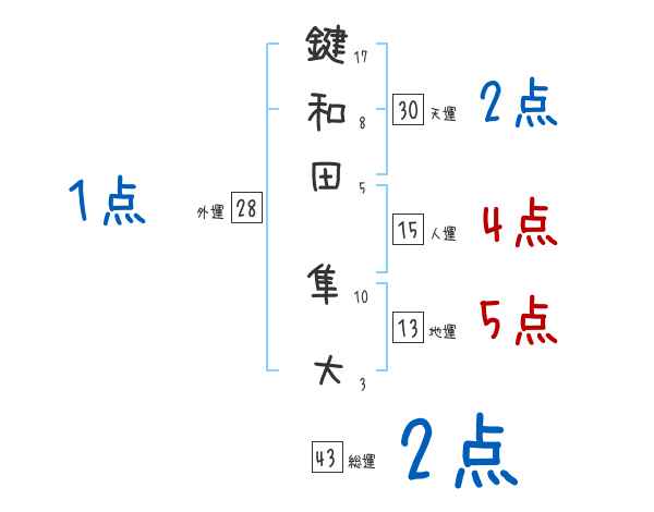 総運![]() | 鍵和田隼大さんの総運は43画の2つ星!頑固な性格で独立心が強いかも。やや非現実的で浪費に注意しましょう。 あなたの人生を表す1番重要な運勢です。生涯を通じて影響する総合運となり、主に50歳以降の晩年期に影響を及ぼします。 |