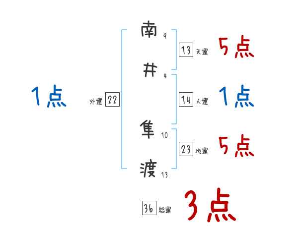 外運![]() | 南井隼渡さんの外運は22画の1つ星!努力することが苦手ないっぽう手先が器用。芸術性にも優れる。 生活面を象徴する運勢です。外部から受ける影響力を表し、結婚運、家庭運や職場、環境への順応性を表します。 |