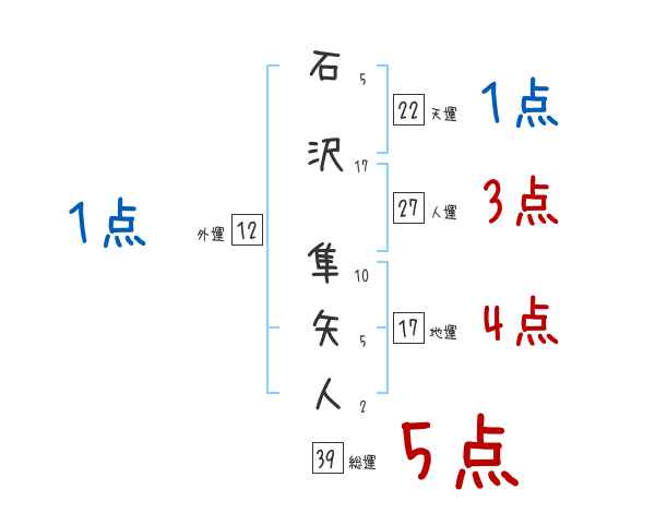 総運![]() | 石沢隼矢人さんの総運は39画の5つ星!社交性に優れ人望が厚い。人の上に立ち成功する。 あなたの人生を表す1番重要な運勢です。生涯を通じて影響する総合運となり、主に50歳以降の晩年期に影響を及ぼします。 |