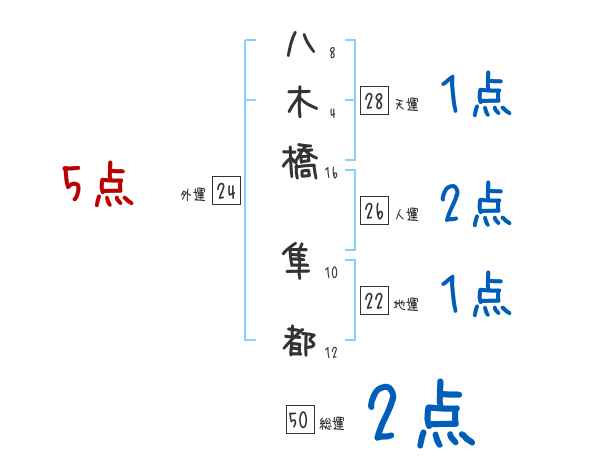 天運![]() | 八木橋隼都さんの天運は28画の1つ星!家庭環境に注意。スポーツで活躍できる能力があるかも。 家系が持つ宿命的な運勢を表します。祖先から受け継いだ苗字ですので自分の力が及びません。家柄を象徴します。 |