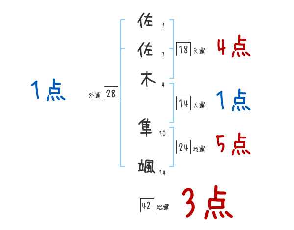 天運![]() | 佐佐木隼颯さんの天運は18画の4つ星!情熱的で剛気。忍耐力があり信頼される。 家系が持つ宿命的な運勢を表します。祖先から受け継いだ苗字ですので自分の力が及びません。家柄を象徴します。 |