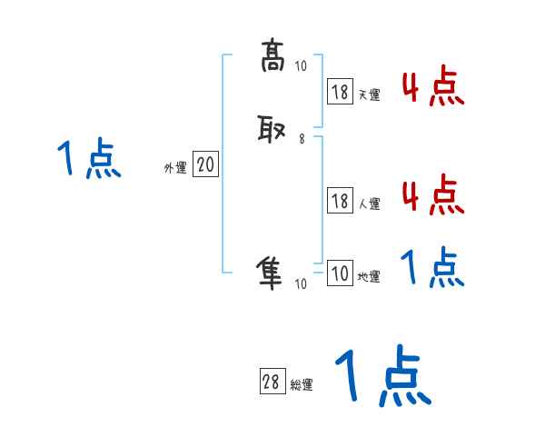 天運![]() | 髙取隼さんの天運は18画の4つ星!情熱的で剛気。忍耐力があり信頼される。 家系が持つ宿命的な運勢を表します。祖先から受け継いだ苗字ですので自分の力が及びません。家柄を象徴します。 |