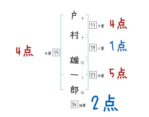 天運![]() | 戸村雄一郎さんの天運は11画の4つ星!着実に富や地位を得る幸運な人生。 家系が持つ宿命的な運勢を表します。祖先から受け継いだ苗字ですので自分の力が及びません。家柄を象徴します。 |