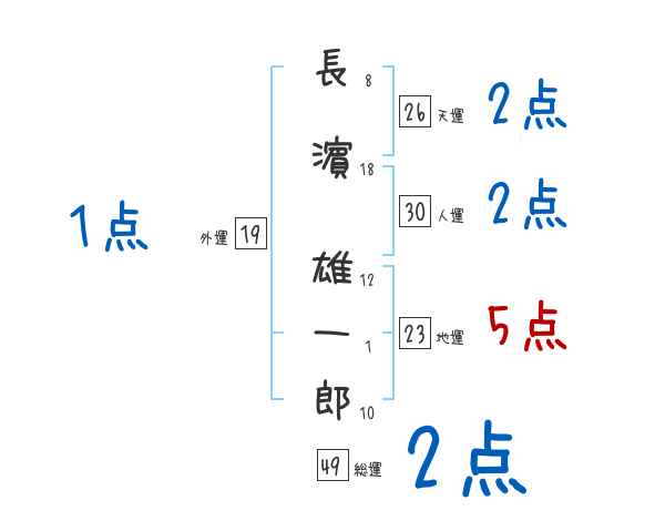 人運![]() | 長濵雄一郎さんの人運は30画の2つ星!浮き沈みの激しさに注意しましょう。 性格や才能などを表す2番目に重要な運勢です。人間関係や協調性、社会的な成功に影響します。主に20歳から50歳ぐらいまでの中年期の運勢を表します。 |