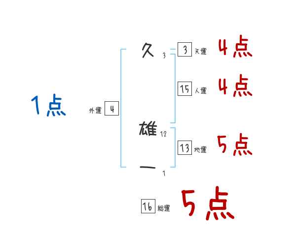 天運![]() | 久雄一さんの天運は3画の4つ星!活動的で才能に恵まれ、多くの信頼を得る。希望に満ち成長する。 家系が持つ宿命的な運勢を表します。祖先から受け継いだ苗字ですので自分の力が及びません。家柄を象徴します。 |