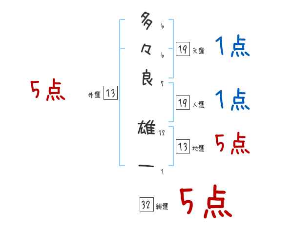 総運![]() | 多々良雄一さんの総運は32画の5つ星!柔軟性があり成功する。チャンスが多く金運が良い。 あなたの人生を表す1番重要な運勢です。生涯を通じて影響する総合運となり、主に50歳以降の晩年期に影響を及ぼします。 |