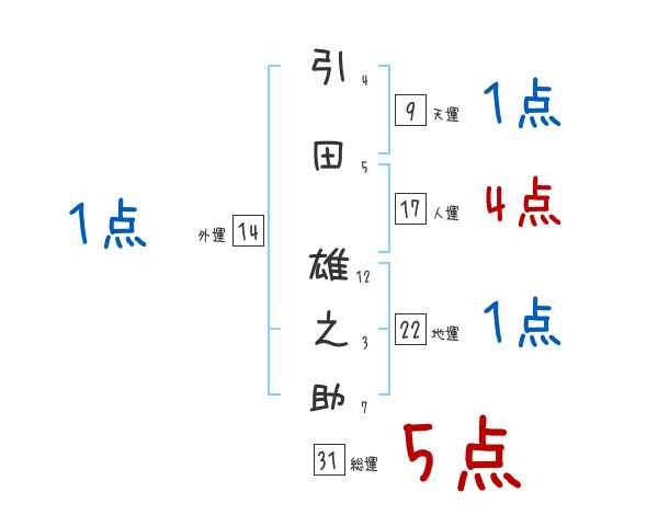 外運![]() | 引田雄之助さんの外運は14画の1つ星!人に対して優しいがストレスを溜め込みがち。人間関係のトラブルを避けるよう気をつけましょう。 生活面を象徴する運勢です。外部から受ける影響力を表し、結婚運、家庭運や職場、環境への順応性を表します。 |