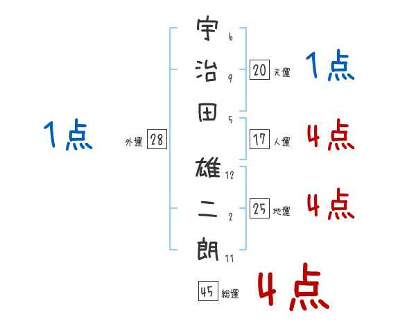 総運![]() | 宇治田雄二朗さんの総運は45画の4つ星!もくもくと物事を進め達成する。地味な努力家。 あなたの人生を表す1番重要な運勢です。生涯を通じて影響する総合運となり、主に50歳以降の晩年期に影響を及ぼします。 |