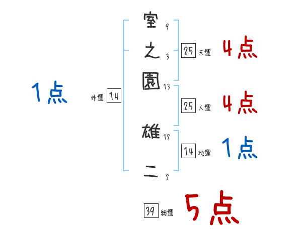 総運![]() | 室之園雄二さんの総運は39画の5つ星!社交性に優れ人望が厚い。人の上に立ち成功する。 あなたの人生を表す1番重要な運勢です。生涯を通じて影響する総合運となり、主に50歳以降の晩年期に影響を及ぼします。 |