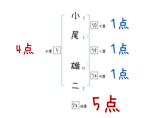 外運![]() | 小尾雄二さんの外運は5画の4つ星!健康で安泰。協調性に優れ、財産に恵まれる。 生活面を象徴する運勢です。外部から受ける影響力を表し、結婚運、家庭運や職場、環境への順応性を表します。 |