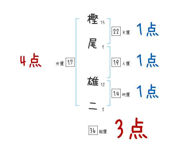 外運![]() | 樫尾雄二さんの外運は17画の4つ星!積極的な行動力。地位を気づき財産を手に入れる。純粋な心と直感力。 生活面を象徴する運勢です。外部から受ける影響力を表し、結婚運、家庭運や職場、環境への順応性を表します。 |