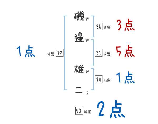 外運![]() | 磯邊雄二さんの外運は19画の1つ星!優れた才能を持ちますが、協調性が足りないことも。周りの人と協力する事を意識しましょう。 生活面を象徴する運勢です。外部から受ける影響力を表し、結婚運、家庭運や職場、環境への順応性を表します。 |