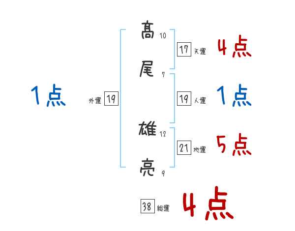 総運![]() | 髙尾雄亮さんの総運は38画の4つ星!温厚な性格で技術的な才能を発揮する。職人的な仕事に向いている。 あなたの人生を表す1番重要な運勢です。生涯を通じて影響する総合運となり、主に50歳以降の晩年期に影響を及ぼします。 |