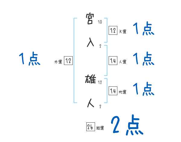 天運![]() | 宮入雄人さんの天運は12画の1つ星!簡単な失敗で諦めてしまいやすいかも。着実に行動すると良いでしょう。 家系が持つ宿命的な運勢を表します。祖先から受け継いだ苗字ですので自分の力が及びません。家柄を象徴します。 |