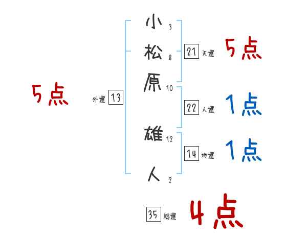 総運![]() | 小松原雄人さんの総運は35画の4つ星!温厚な性格で感受性が高い。穏和な性格で人望が厚い。 あなたの人生を表す1番重要な運勢です。生涯を通じて影響する総合運となり、主に50歳以降の晩年期に影響を及ぼします。 |