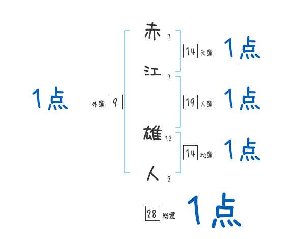 総運![]() | 赤江雄人さんの総運は28画の1つ星!家庭環境に注意。スポーツで活躍できる能力があるかも。 あなたの人生を表す1番重要な運勢です。生涯を通じて影響する総合運となり、主に50歳以降の晩年期に影響を及ぼします。 |