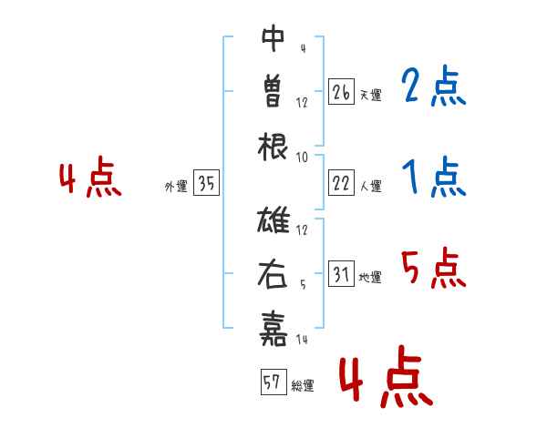 外運![]() | 中曽根雄右嘉さんの外運は35画の4つ星!温厚な性格で感受性が高い。穏和な性格で人望が厚い。 生活面を象徴する運勢です。外部から受ける影響力を表し、結婚運、家庭運や職場、環境への順応性を表します。 |