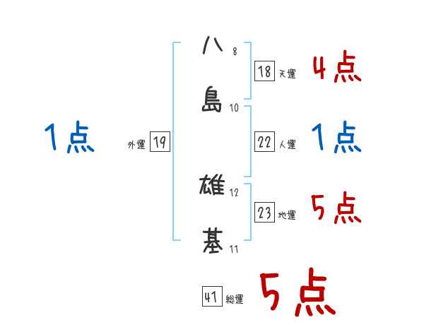 天運![]() | 八島雄基さんの天運は18画の4つ星!情熱的で剛気。忍耐力があり信頼される。 家系が持つ宿命的な運勢を表します。祖先から受け継いだ苗字ですので自分の力が及びません。家柄を象徴します。 |