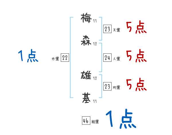 天運![]() | 梅森雄基さんの天運は23画の5つ星!想像力に優れ活力がある。一代で成功し名誉を手に入れる。 家系が持つ宿命的な運勢を表します。祖先から受け継いだ苗字ですので自分の力が及びません。家柄を象徴します。 |