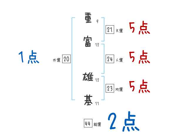 天運![]() | 重富雄基さんの天運は21画の5つ星!統率力がある。独立し成功する。名誉を手に入れる。 家系が持つ宿命的な運勢を表します。祖先から受け継いだ苗字ですので自分の力が及びません。家柄を象徴します。 |