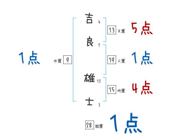 天運![]() | 吉良雄士さんの天運は13画の5つ星!才能に恵まれ人気がある。名声を手に入れる。円満な人生。 家系が持つ宿命的な運勢を表します。祖先から受け継いだ苗字ですので自分の力が及びません。家柄を象徴します。 |