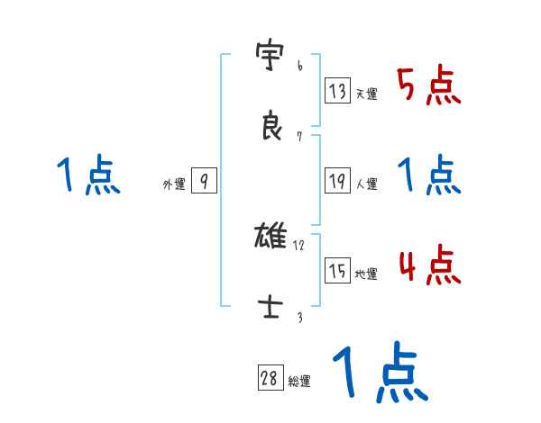 天運![]() | 宇良雄士さんの天運は13画の5つ星!才能に恵まれ人気がある。名声を手に入れる。円満な人生。 家系が持つ宿命的な運勢を表します。祖先から受け継いだ苗字ですので自分の力が及びません。家柄を象徴します。 |