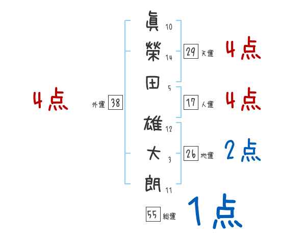 外運![]() | 眞榮田雄大朗さんの外運は38画の4つ星!温厚な性格で技術的な才能を発揮する。職人的な仕事に向いている。 生活面を象徴する運勢です。外部から受ける影響力を表し、結婚運、家庭運や職場、環境への順応性を表します。 |