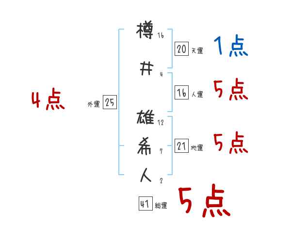 人運![]() | 樽井雄希人さんの人運は16画の5つ星!人望が厚く大きく発展する。逆転成功が見える。 性格や才能などを表す2番目に重要な運勢です。人間関係や協調性、社会的な成功に影響します。主に20歳から50歳ぐらいまでの中年期の運勢を表します。 |