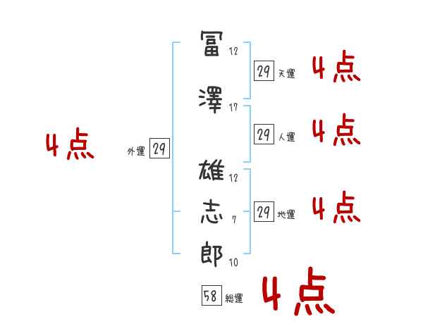 外運![]() | 冨澤雄志郎さんの外運は29画の4つ星!完全主義で才能がある。厳格な心の持ち主。 生活面を象徴する運勢です。外部から受ける影響力を表し、結婚運、家庭運や職場、環境への順応性を表します。 |