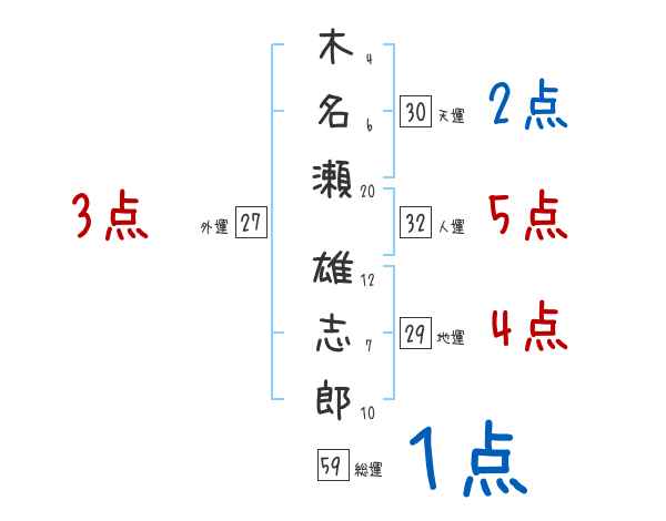 天運![]() | 木名瀬雄志郎さんの天運は30画の2つ星!浮き沈みの激しさに注意しましょう。 家系が持つ宿命的な運勢を表します。祖先から受け継いだ苗字ですので自分の力が及びません。家柄を象徴します。 |