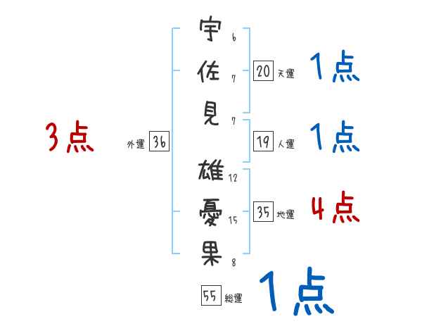 総運![]() | 宇佐見雄憂果さんの総運は55画の1つ星!欲張りな性格で軽率な行動に注意しましょう。病気に気をつけて。 あなたの人生を表す1番重要な運勢です。生涯を通じて影響する総合運となり、主に50歳以降の晩年期に影響を及ぼします。 |