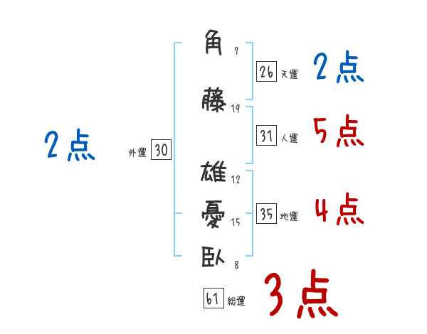 総運![]() | 角藤雄憂臥さんの総運は61画の3つ星!強情な性格でうぬぼれタイプ。自ら破滅する。 あなたの人生を表す1番重要な運勢です。生涯を通じて影響する総合運となり、主に50歳以降の晩年期に影響を及ぼします。 |