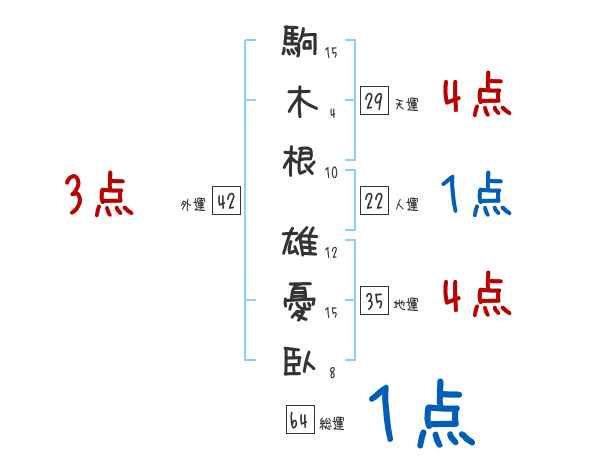 天運![]() | 駒木根雄憂臥さんの天運は29画の4つ星!完全主義で才能がある。厳格な心の持ち主。 家系が持つ宿命的な運勢を表します。祖先から受け継いだ苗字ですので自分の力が及びません。家柄を象徴します。 |