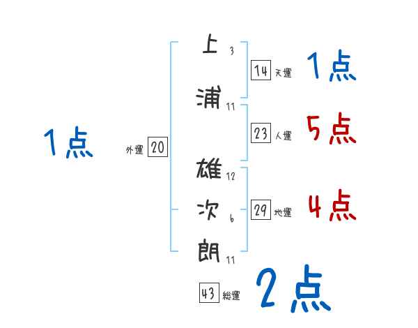 天運![]() | 上浦雄次朗さんの天運は14画の1つ星!人に対して優しいがストレスを溜め込みがち。人間関係のトラブルを避けるよう気をつけましょう。 家系が持つ宿命的な運勢を表します。祖先から受け継いだ苗字ですので自分の力が及びません。家柄を象徴します。 |