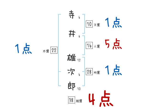 外運![]() | 寺井雄次郎さんの外運は22画の1つ星!努力することが苦手ないっぽう手先が器用。芸術性にも優れる。 生活面を象徴する運勢です。外部から受ける影響力を表し、結婚運、家庭運や職場、環境への順応性を表します。 |