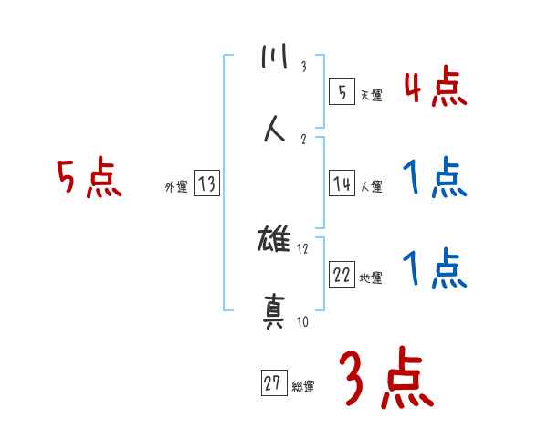 外運![]() | 川人雄真さんの外運は13画の5つ星!才能に恵まれ人気がある。名声を手に入れる。円満な人生。 生活面を象徴する運勢です。外部から受ける影響力を表し、結婚運、家庭運や職場、環境への順応性を表します。 |