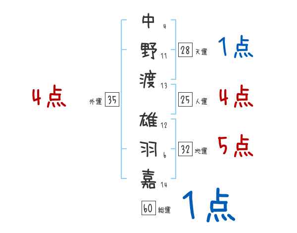 中野渡雄羽嘉さんの画数の鑑定結果