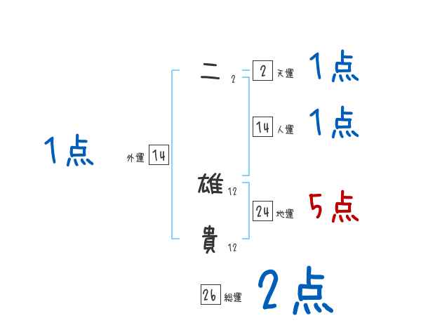 外運![]() | 二雄貴さんの外運は14画の1つ星!人に対して優しいがストレスを溜め込みがち。人間関係のトラブルを避けるよう気をつけましょう。 生活面を象徴する運勢です。外部から受ける影響力を表し、結婚運、家庭運や職場、環境への順応性を表します。 |